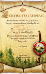 Jeder Märchenartikel kommt mit einem Echtheitszertifikat und einem hübschen Sticker unserer Marionette "Dini Door" zu Ihnen nach Hause. Dadurch kommt der Geschenkcharackter noch mehr zum Tragen-